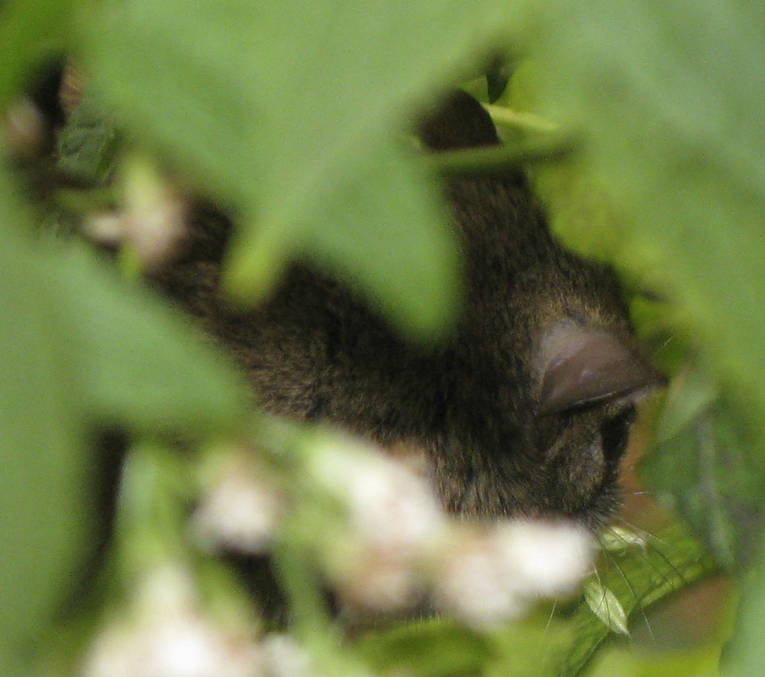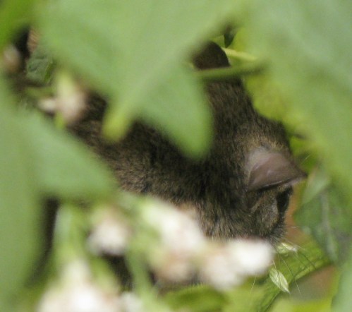 Awwwww…. Some three feet off the ground, in the thick of the plants. We think it’s a young brown rat, Rattus norvegicus, whiskers atwitter.