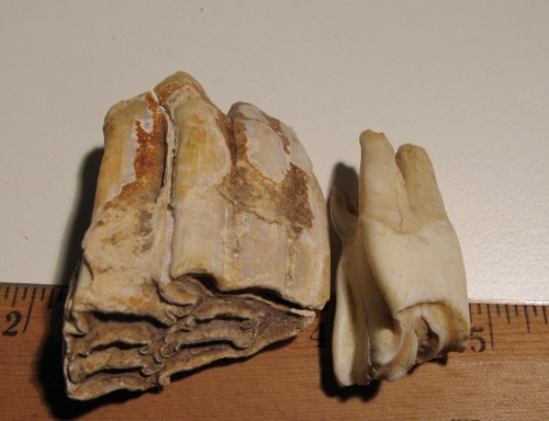 The tooth on the left was found at Dead Horse Bay. I think it’s actually two fused together because of the four roots. This is what I photographed for my Mystery post early this month.