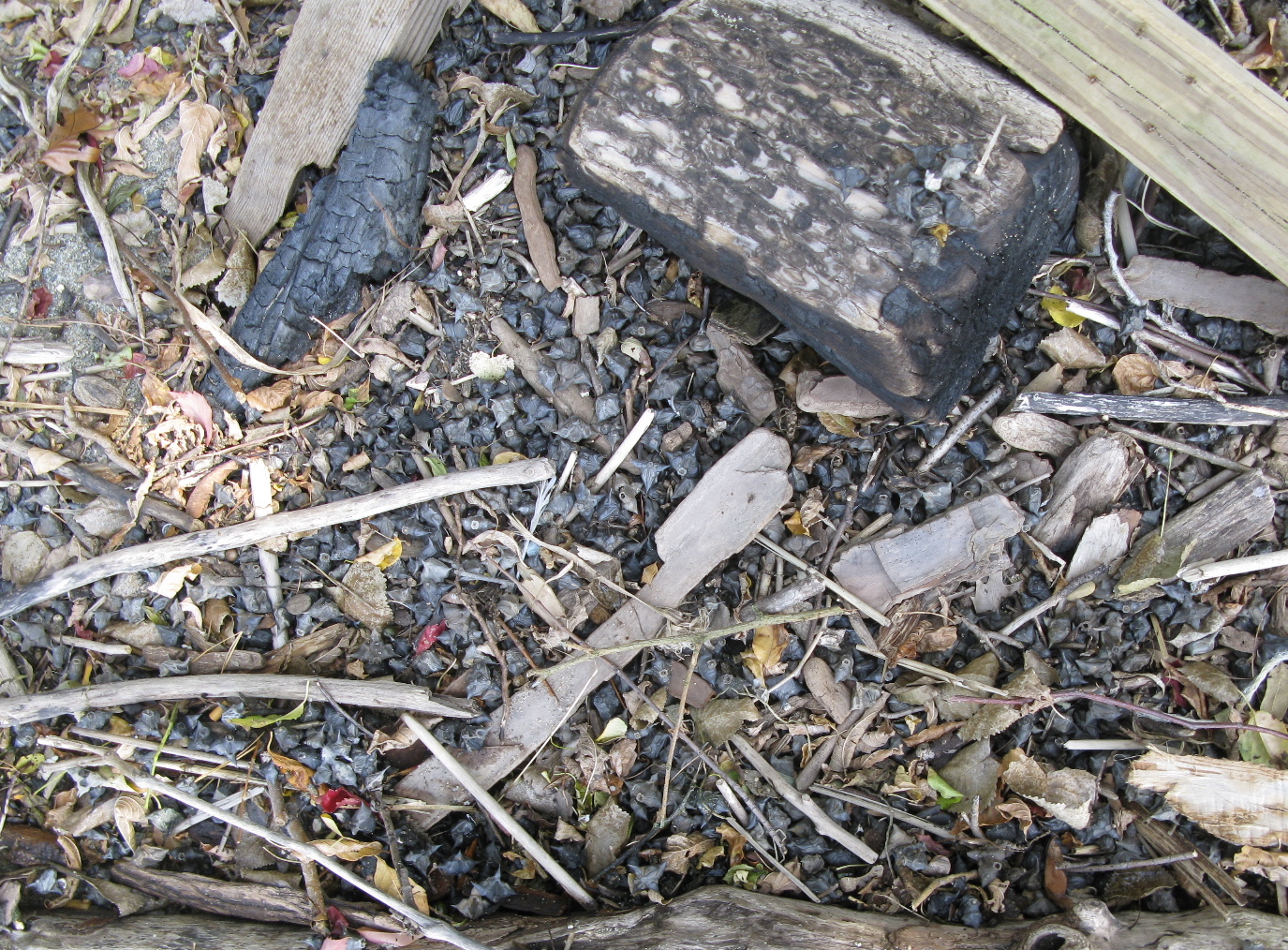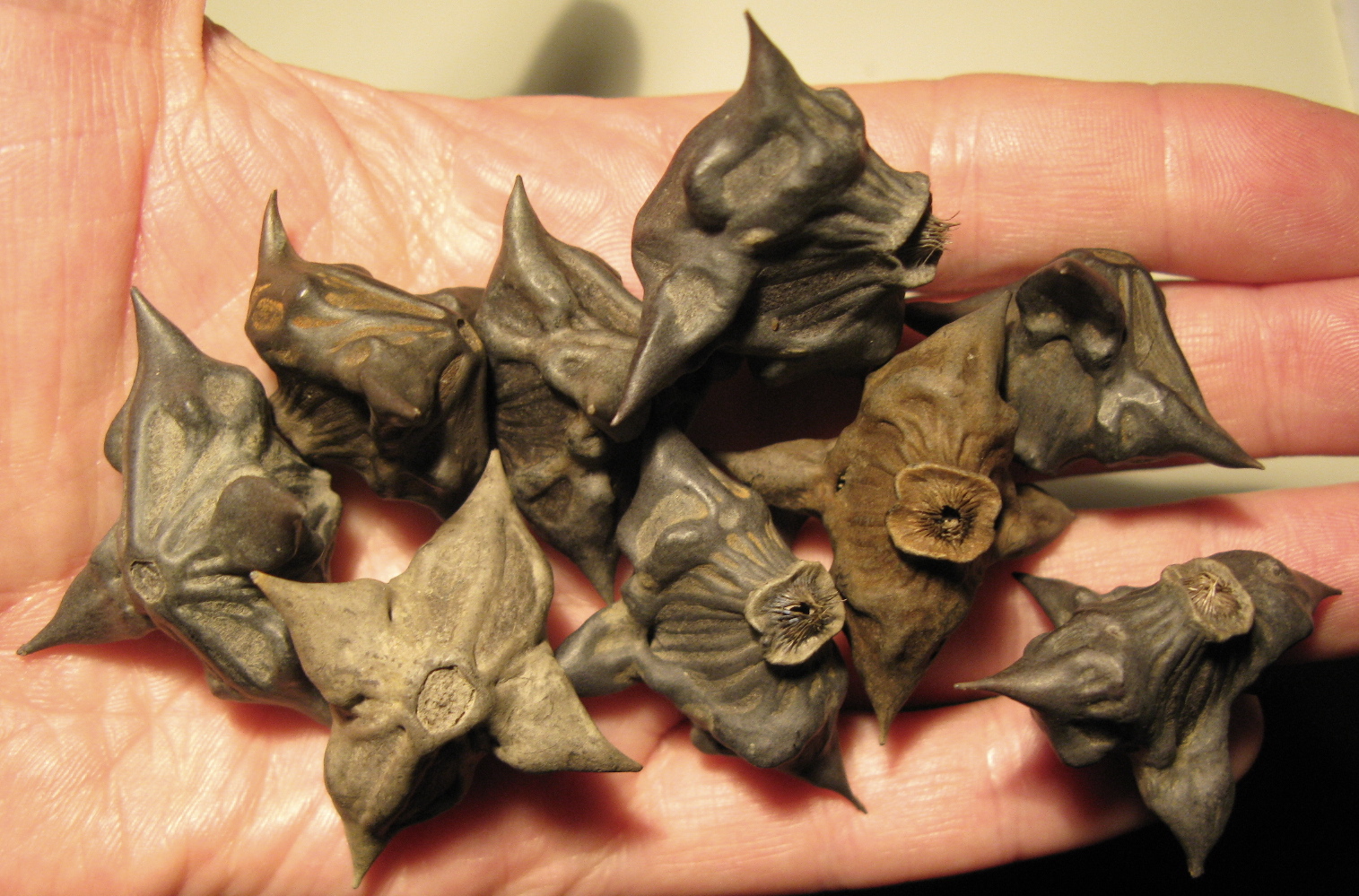 Water chestnut, devil pod, water clatrop, Trapa natans. Masses of the floating seedpods were cluttered along the wrackline at Little Stony Point.