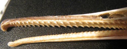 This is a Red-Breasted Merganser’s bill, I think (the other option is the Common Merganser); note how the serration points backwards, to keep slippery aquatic prey from slipping out.