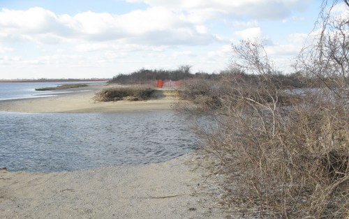 This has turned the (mostly) fresh water pond into a tidal corner of the larger Bay. It’s a radical change. While the tidal flats should be good for shorebirds, freshwater-loving waterfowl have abandoned the Pond. An important regional bird refuge has thus essentially been halved (the East Pond is in better shape). I, and many others, are hoping the NPS, which runs JBWR as part of Gateway National Recreation Area, engineer a solution. As of this date, though, the future status of the breach remains unclear. It isn’t just a matter of closing the breach; the Pond would have to be re-freshwatered. On the plus side, the salt may kill off the phragmites.