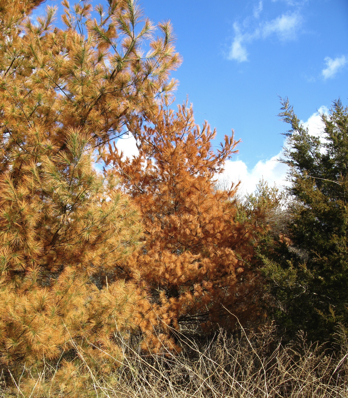 Meanwhile, tidal wrack still clogs the area, north of the path, and, as pretty as these pines look, they are dying.