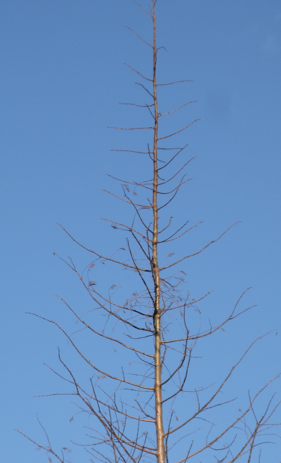 The distinctive cone shape of the Dawn Redwood (Metasequoia glyptostroboides) is actually kind of similar to the distinctive cone shape of the Bald Cypress (Taxodium distichum). Both species grace Brooklyn Bridge Park and both appear “bald” this time of year. And, in the cold, battened down — or maybe that was just me, being iced in the cheek by the wind off the water.