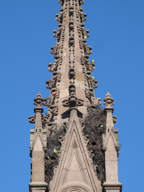 The Monk Parakeets, also known as Quaker Parrots (Myiopsitta monachus) in Green-Wood Cemetery were celebrating the return of (barely) above freezing temperatures yesterday with their usual racket.