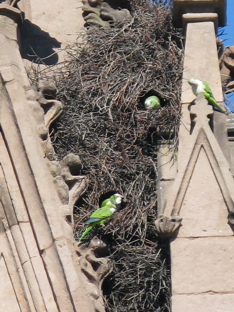 Once, long ago in Green-Wood, with my bins in hand identifying me as a weirdo, a couple came up and asked if I was there to look at the Quakers. It was my assumption they were all buried in the Quaker Cemetery in Prospect Park. Thus I learned the alternative name of the Monks. Meanwhile, “parrot” and “parakeet” are often used interchangeably for the Psittaciformes; the smaller of these colorful, (usually) tropical birds generally get called parakeets, since this basically means small parrot. Since we no longer have the Carolina Parakeet to marvel at, up here at the edges of its once mighty range, these guys will do in a pinch.