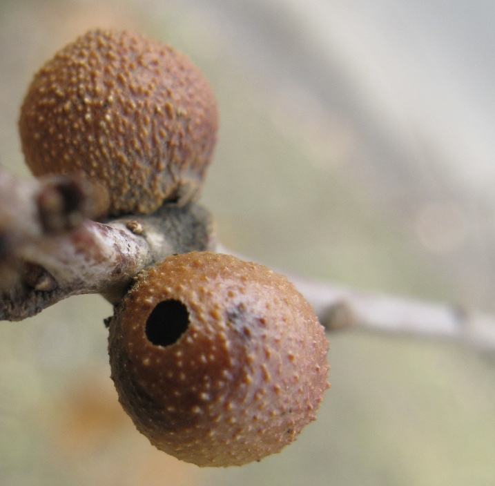 The exit holes: the female wasps within (there are only females this generation) should have emerged during autumn to deposit over-wintering eggs on the tree’s buds (I looked but wasn’t sure what I was looking for); the generation from these eggs on the buds, which will hatch out in the spring, will be the reproductive one, producing both males and females.
