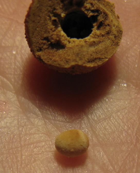 Remember that these galls are created by the tree itself, as a kind of containment system around the irritation of the gall wasp’s eggs and then larvae. The miniscule wasp is forcing the tree to house and protect its tender larvae, chemically commanding the tree to work for it (most galls are harmless to the host plant). The image above shows where the gall was attached, extended, connected to the leaf. And inside?