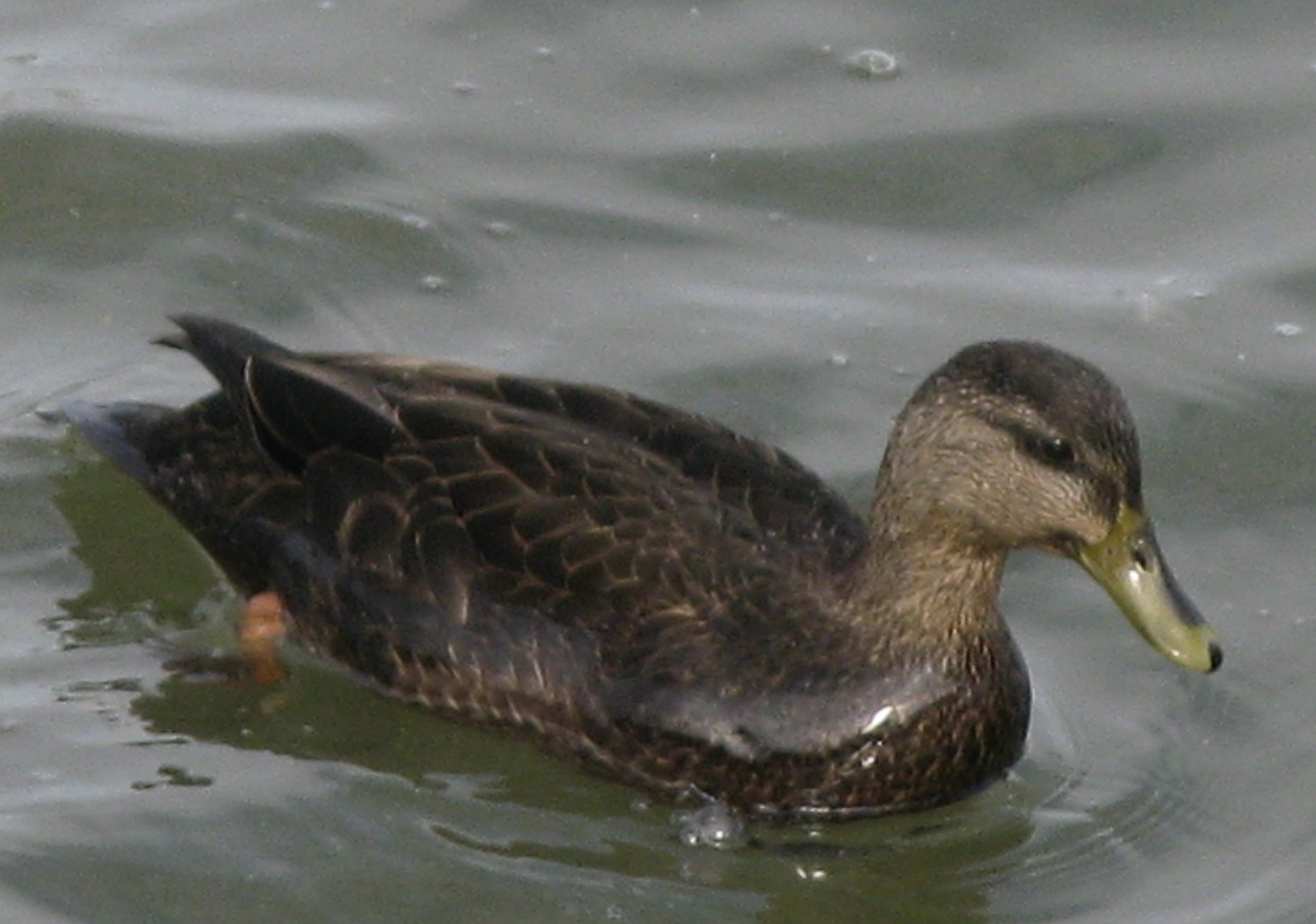 The American Black Duck (Anas rubripes) is often found with Mallard Ducks (Anas platyrhynchos), looks somewhat like the female of that ubiquitous species, and sometimes interbreeds with our most recognizable duck, making for hybrids that mix characteristics of the species. This pair looks relatively un-hybridized, with dark orange legs, dark feathers, strong eyeline, olive-yellowish bills.