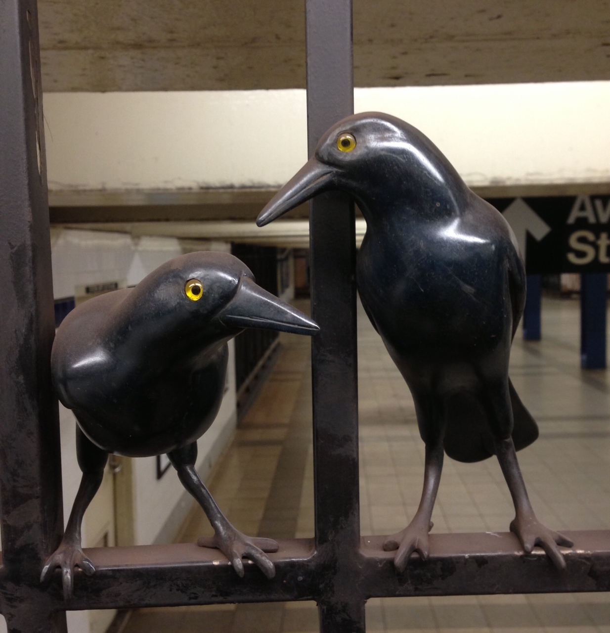 The birds are on the mezzanine level, and I think most can be seen without having to go through the turnstiles. The crows are on top what we used to call the token booth, roughly in the center of the station. Enjoy!