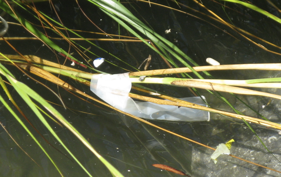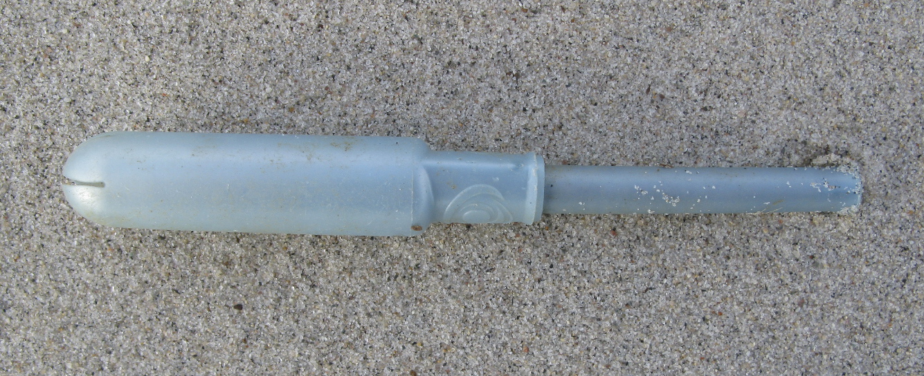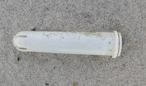 What a fascinating life cycle! After their soft and spongy innards are consumed by female Homo sapiens, these indestructible exoskeleton-sheaths journey through the social network of the sewer system. (Males H. not so sapiens do sometimes use them, although judging from HRH Charles, Prince of Wales, only in a metaphoric sense.) Ubiquitous on our beaches, these shed applicators also pile up in sludge digesters at sewage treatment plants.