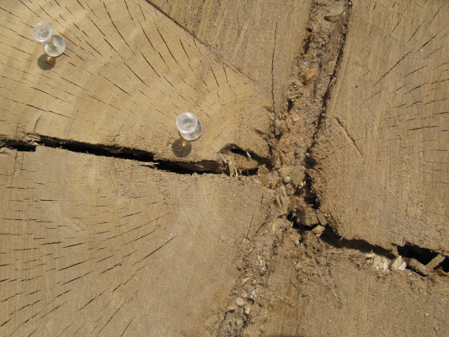 Green-Wood Cemetery, like the city at large, lost a mess of trees during Sandy. One of them was this giant, which was also the home of a Red-tailed hawk nest for several years. Judging from Facebook, these pins were probably put in by the Cemetery’s tree specialist, Adam Rychlicki, who has been doing this sort of thing lately. It looks like each pin marks 10 years of growth here, except for what looks like the five years below:
