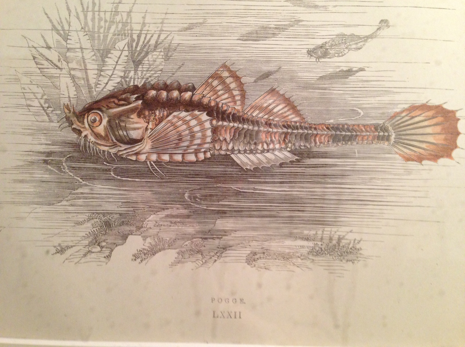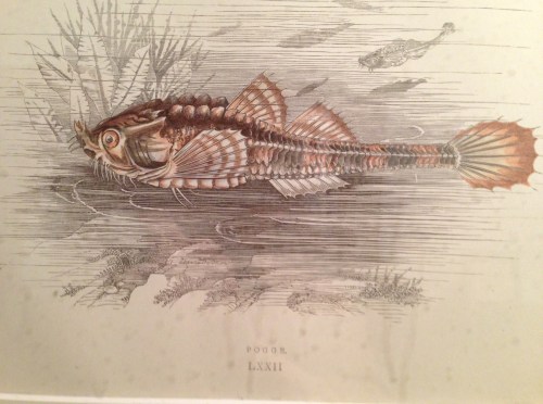 This I found in the unisex bathroom in Cornelius on Vanderbilt. There is, in fact, a fish called the Pogge: it’s Agonus cataphractus, a small fish found in British waters. When such prints are untimely ripped from books, a lot of the context vanishes, but the untrusty old innernets can help.