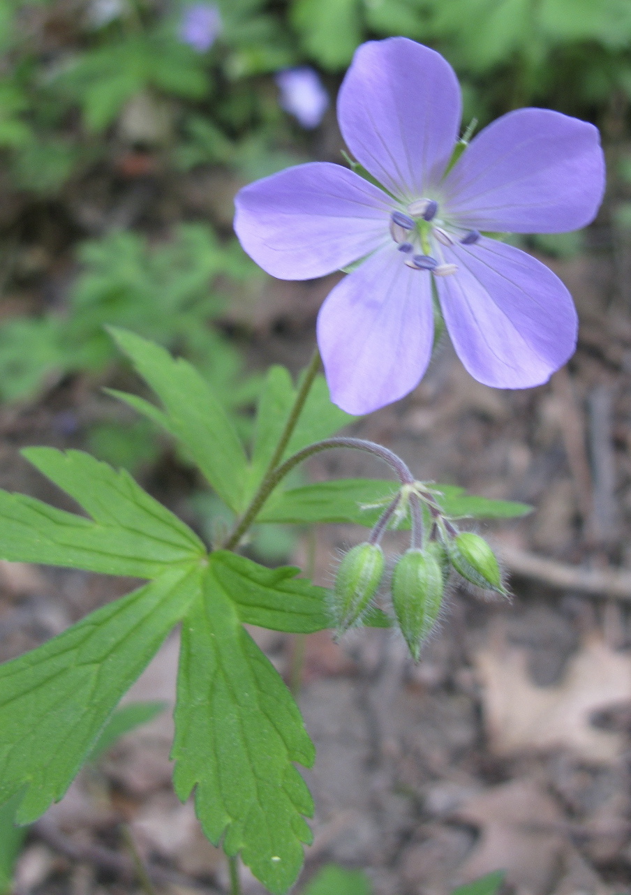 Pictured: In the Ravine, a Wild Geranium, or Crane’s Bill, so named because of the beak-like seed capsule (to come, should this survive the fence-jumpers, long-armed pickers, loose dogs, etc.). The genus name Geranium comes from geranos, Greek for a crane. Newcomb describes the flowers of G. maculatum as “rose-purple”; National Audubon Society says the flowers are “pink or white.”