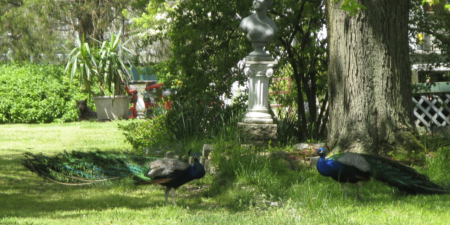 These were a surprise. Peacocks, screaming their haunting woman-in-peril scream on the grounds of the Seguine Mansion. Flannery O’Connor, who lived on a farm with 40 peafowl, said about the carrying voices of these birds, “To the melancholy this sound is melancholy, and to the hysterical it is hysterical.” From a block away, and not photographed, we watched a feral cat walk out into the middle of a lane of Seguine Avenue and sit there, that placid-seeming cat-sitting attitude, as a raccoon ambled across its bow.