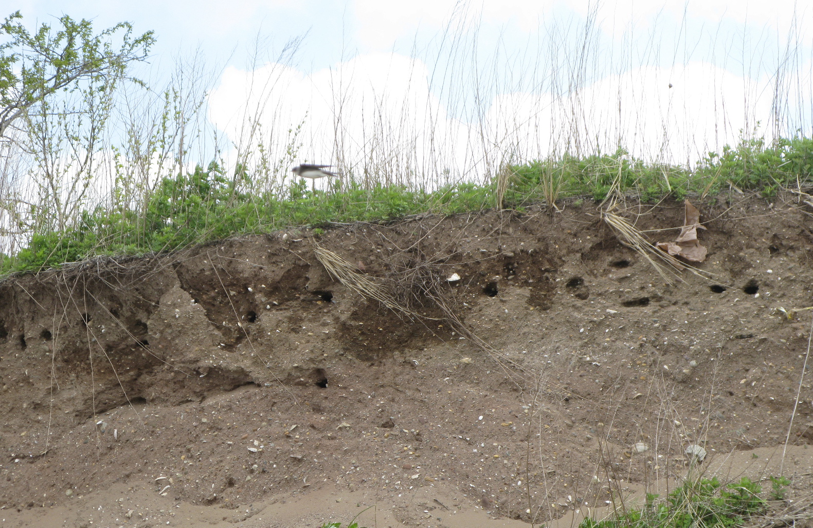 Riparia riparia, of the wonderful binomial, are our smallest species of sparrow. They make tunnels in bank sides along rivers, coasts, etc., to nest in. (The family Hirundinidae has quite a variety of nesting strategies.) Since such landforms are inherently unstable — you can see the raw reddish earth where Sandy made new cliffs further east on the beach — these swallows’ nesting sites may shift from breeding season to breeding season.