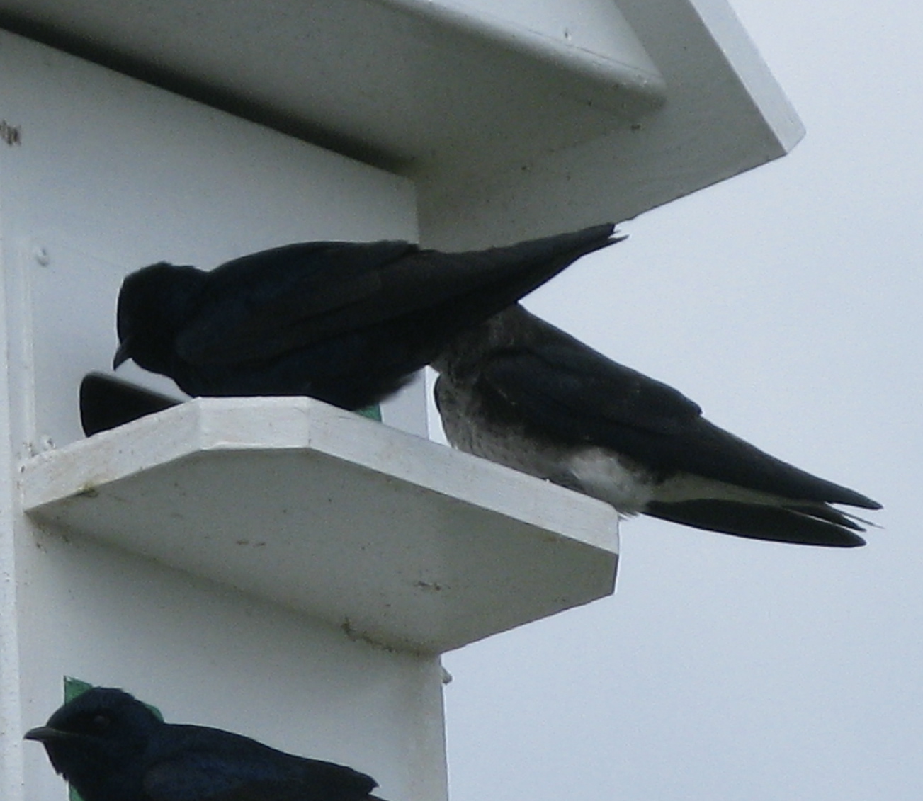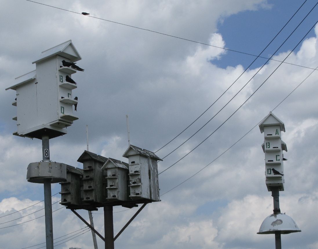 The male Martin is bluish/purplish black, the female rather less glittery, with a very pale underside as seen here on the top right. A couple of Martin decoys are attached to the houses to lure this acrobatic insectivores in, one of them tipped over like a drunken fowl. (These three are the real McCoy Martins, noisy, and fluttery.)