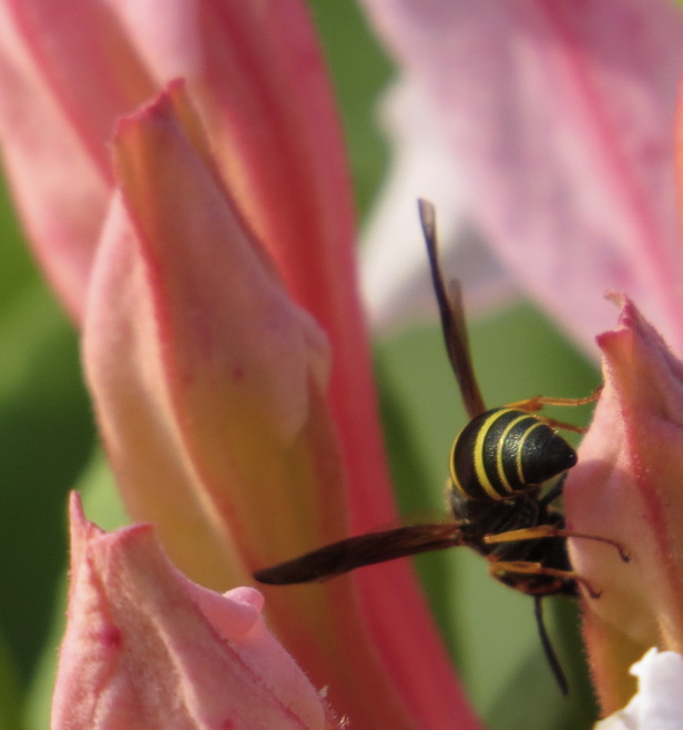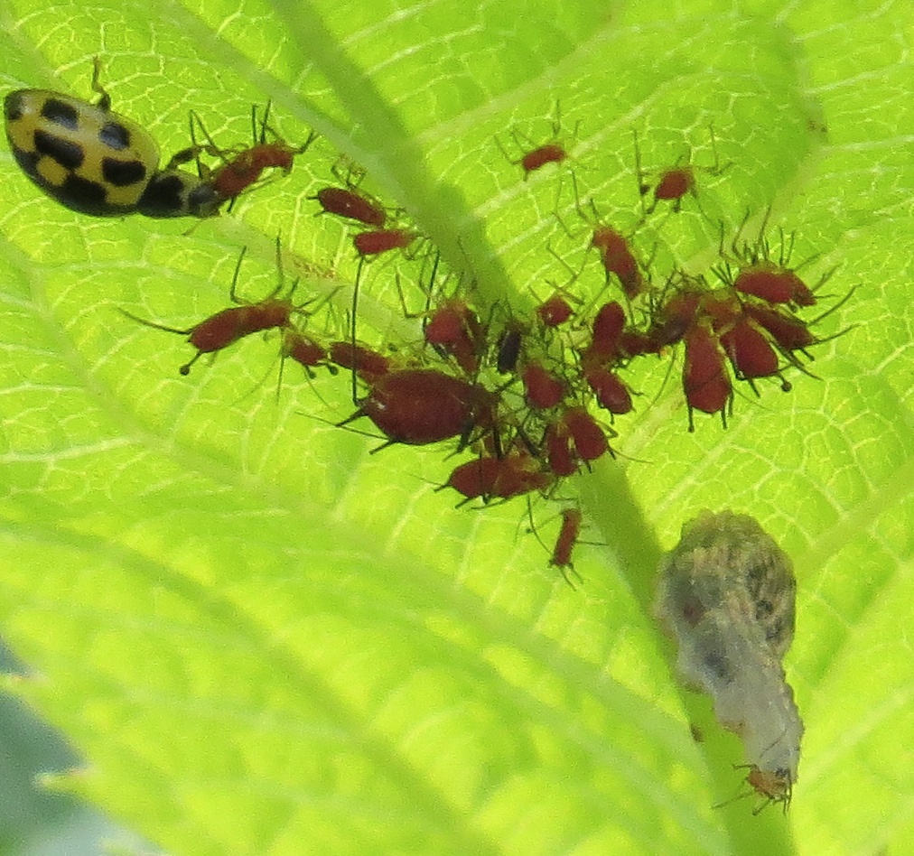 Aphids feasting on plant juices, a 14-spotted lady beetle (Propylea quatuordecimpunctata) and syrphid fly larva (h/t for the ID on this one, Lost Ladybug Project) feeding on aphids.