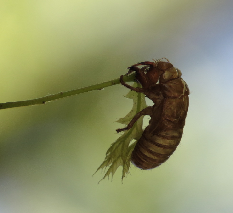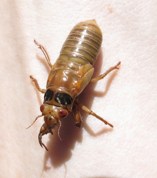 We neither saw, nor heard, a single live adult. Those that survived the rough passage from nymph to adult, and into the safety of the trees, were quiet. We need some more heat, and more cicadas, before the roaring begins. This week is going to get hot and I suspect the next two weeks will be cicadamaniacal. We did find one living nymph. It’s on my arm in the picture at the beginning of this post, as well as here: