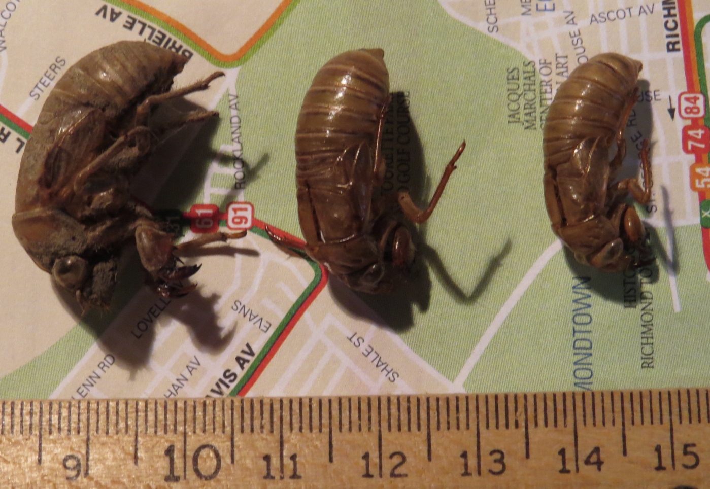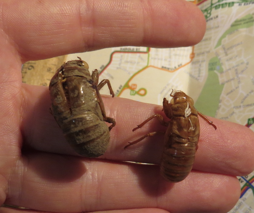 Tibicen on the left. A bigger animal in every way. Center and right are Magicicada. Note the slight size differential between these two Magicicada husks. I can’t tell the husks apart, but there are three species expected on Staten Island: M. septendecim, M.cassini, M, septendecula. This is the guide I’m using for the adults. They all have different songs.