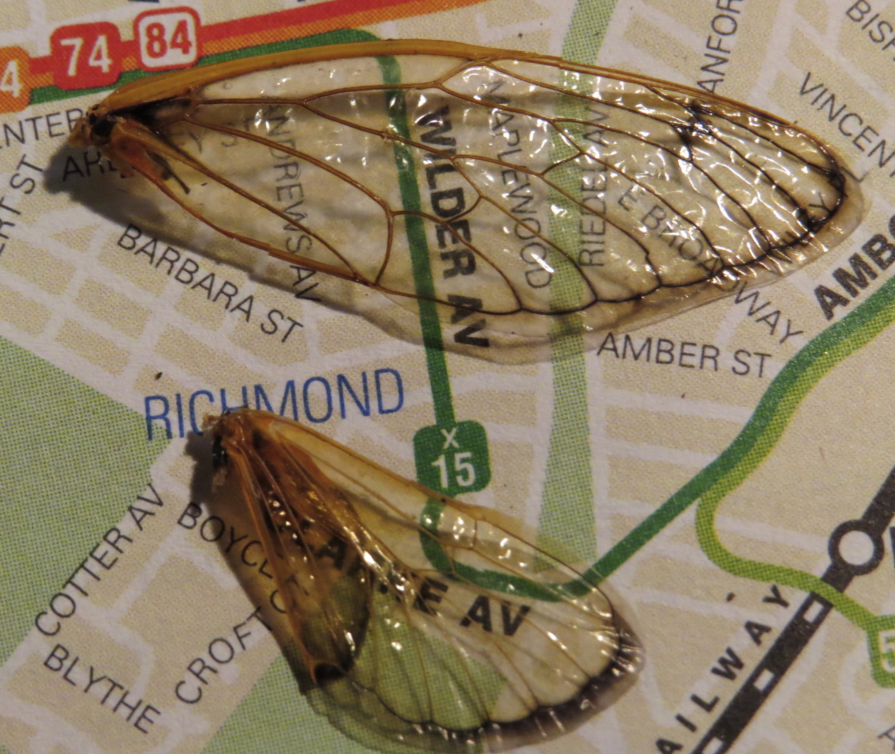 Magicicada forewing and hindwing (or underwing).