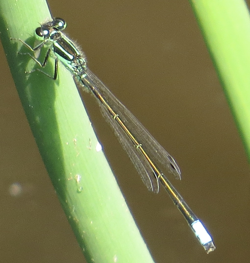 Both dragonflies and damselflies are in the Odonata order. Damselflies are generally smaller, thinner, and when perched have wings closed over their abdomen; dragonflies hold their wings straight out. There were several species of damselflies about this morning, but these are rather harder to ID than the dragonflies: