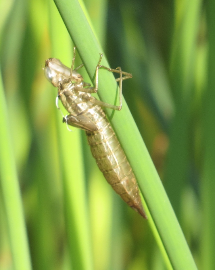 Both Dragonflies and Damselflies have aquatic larval stages; when they emerge, they shed their larval husks, unfurl their wings, and go. We were lucky to spot a single empty exoskeleton, known as an exuvia