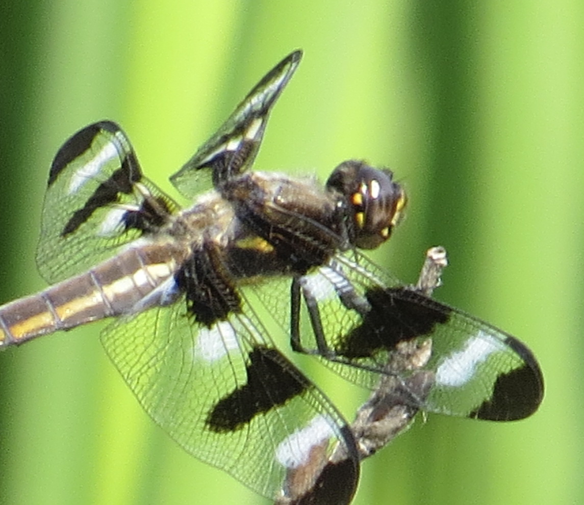 This morning we also saw a Blue Dasher, the most common of dragonflies in the park, and this 12-Spotted Skimmer (Libellula pulchella):