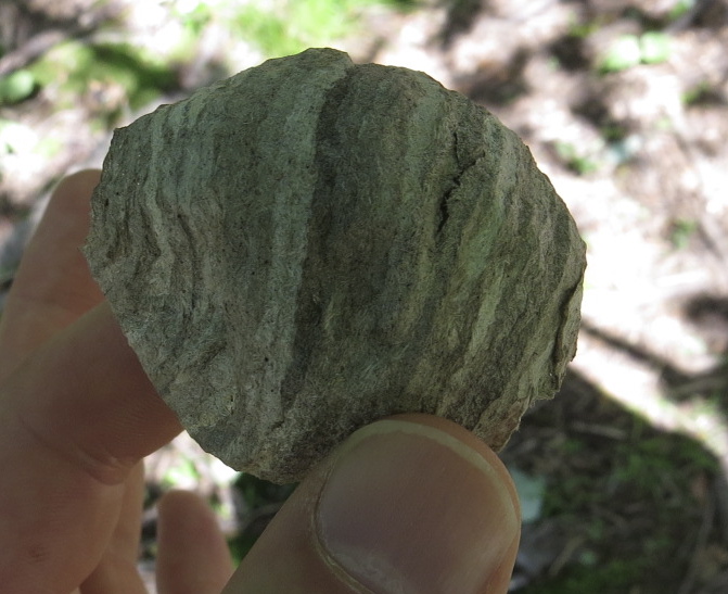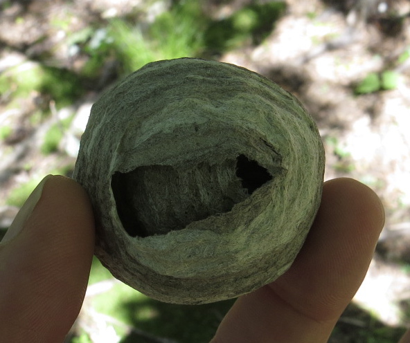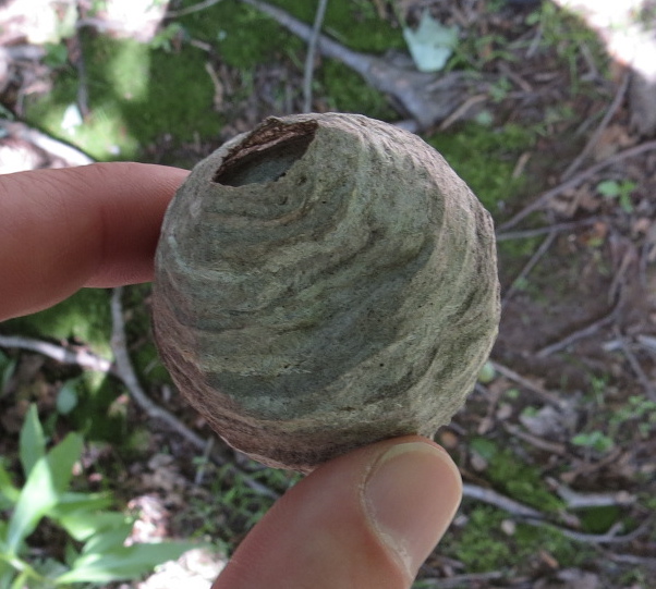 The beginning of a Bald-faced Hornet (Dolichovespula maculata) nest. It would have gotten to be the size of a football (American) if the construction process hadn’t been interrupted.