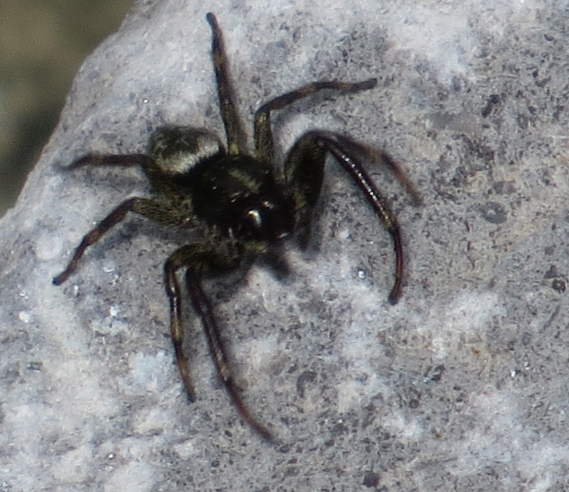 Fiddler crabs in the tiny patch of ever-so-green right now salt marsh at Pier One. On the jumbly rocks next to it, a number of these spiders: