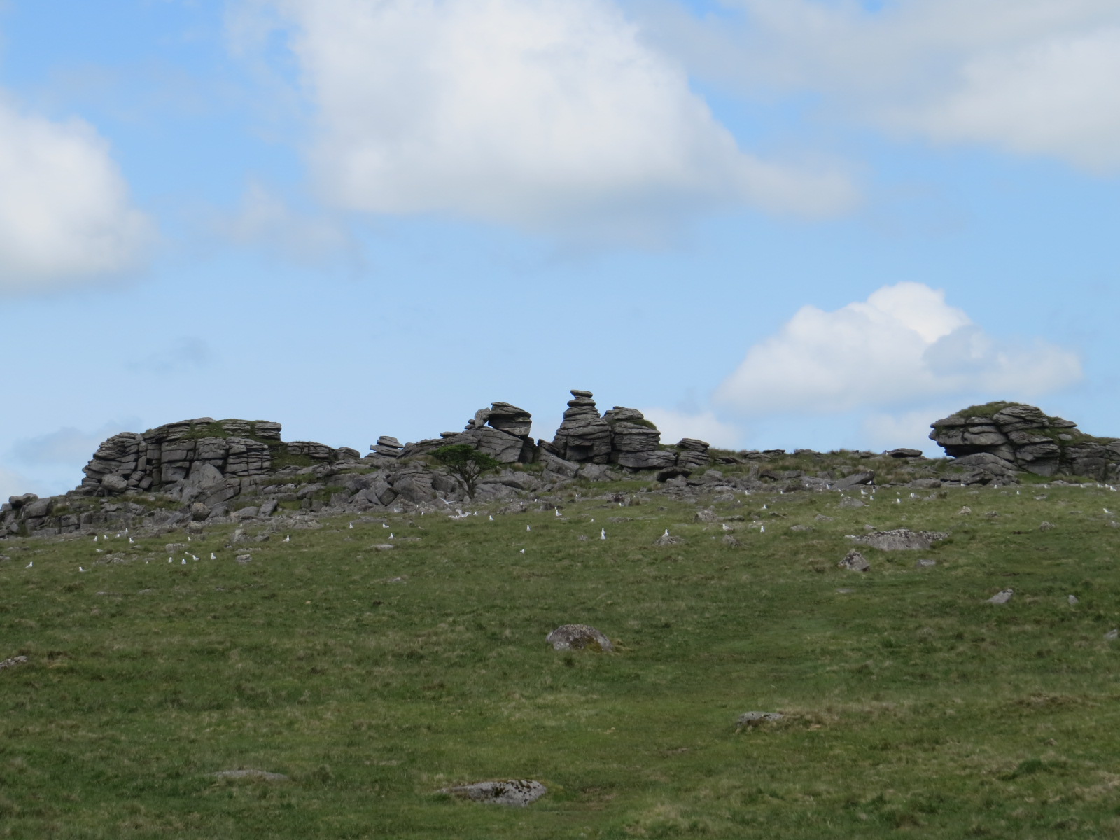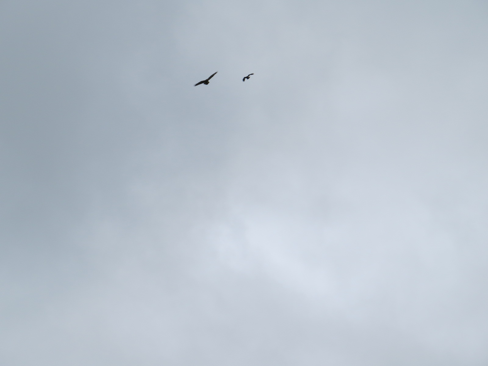 A Buzzard (Buteo buteo) and an unidentified raptor battling it out over Fenworthy Down. Buzzards, akin to our Red-tailed hawks and no relation to our buzzards (vultures), were frequent distant companions on my long walk. In the same place, another flew sentinel in the face of the wind swooping up the Down, seemingly hanging in the air for long moments without moving its wings. (I think the name “buzzard” comes out of the Latin buteo via the French.)