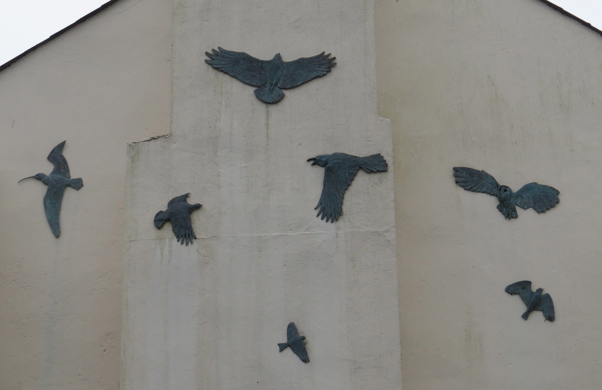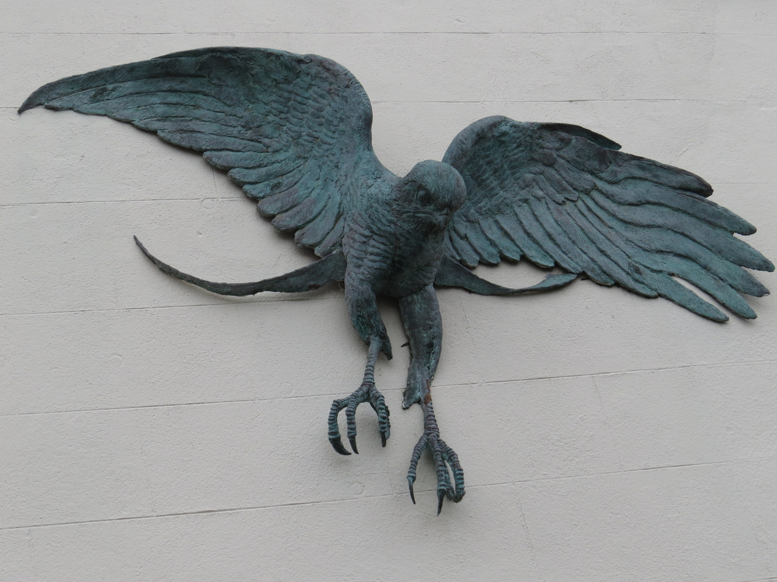 The town of Moretonhampstead was chartered by King John in the 13th century. For rent, John called for an annual delivery of a Sparrowhawk (Accipiter nisus). Falconry was all the rage. Shades, too, of the Maltese Falcon. This bronze — the oversized talons seem to be a little mammal’s point-of-view — is by Roger Dean, whose work is found elsewhere in town.