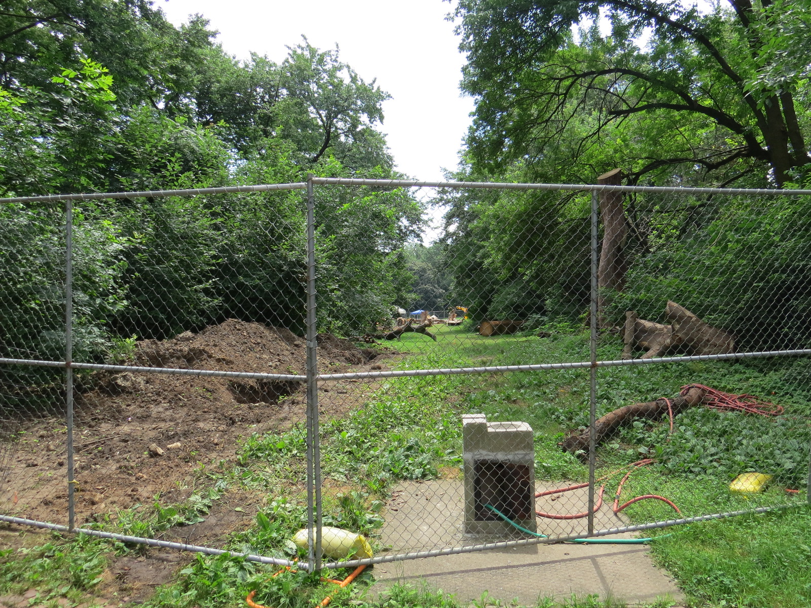 The plutocrat in question wanted a playground made of recycled, Sandy-toppled trees, and by gosh, he got it. Never mind the seven other playgrounds in the park, he wanted a “natural play area” with — oh, the modesty — his name on it. He has, after all, many more dollars to doll out (lessening his tax burden; this is another way our philanthropic systems costs the rest of us even more and undermines democracy) to those who beg from him like good dogs, so his whims must be hastened to. Never mind the things the park really needs. Please, sir, may we have some more? The lengthy construction process has necessitated ripping out plantings — formerly there on the left of the image — paid for by the peasants in hopes of making a particularly fine bird area even more so. An emphatic “fuck you, peasants,” from the gov’nuh and those who jump when he signs the check.