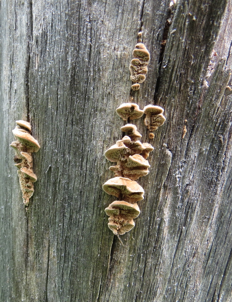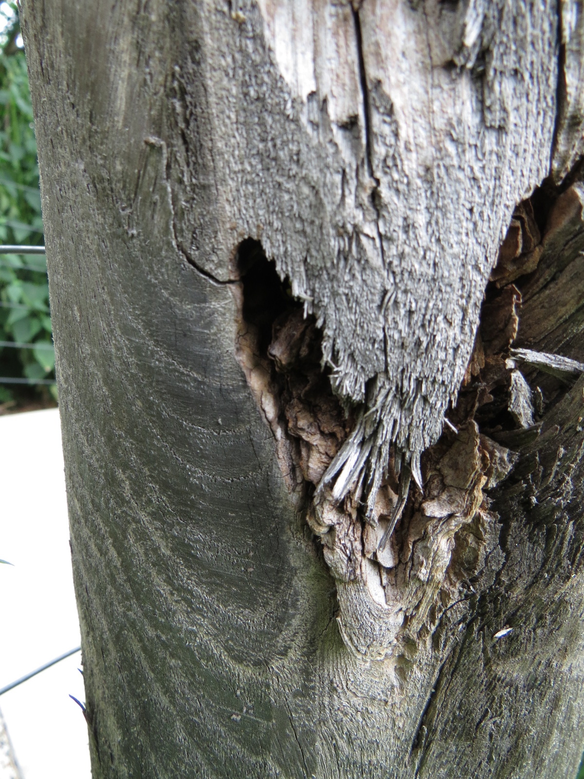 The wood itself is home. I saw an unidentified insect — something Diptera or Hymenoptera — crawl into the hole on the left of this knot. I waited a while, but nothing emerged, so the mystery about what is nesting here remains.
