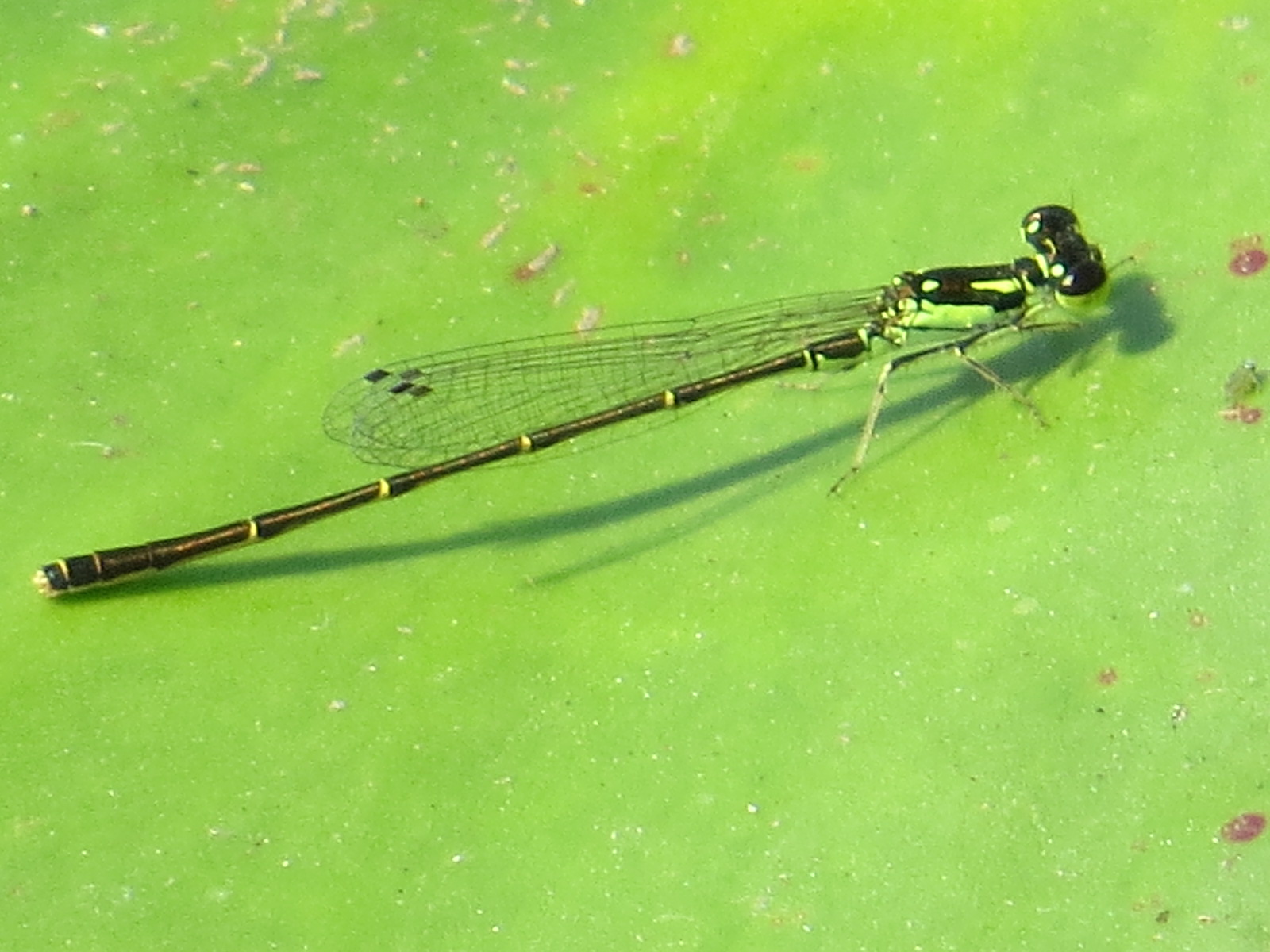 Immature female Lilypad Forktail (Ischnura kellicotti). Just over an inch long. Without binoculars or telephoto, it’s hard to see this gorgeous orange color.