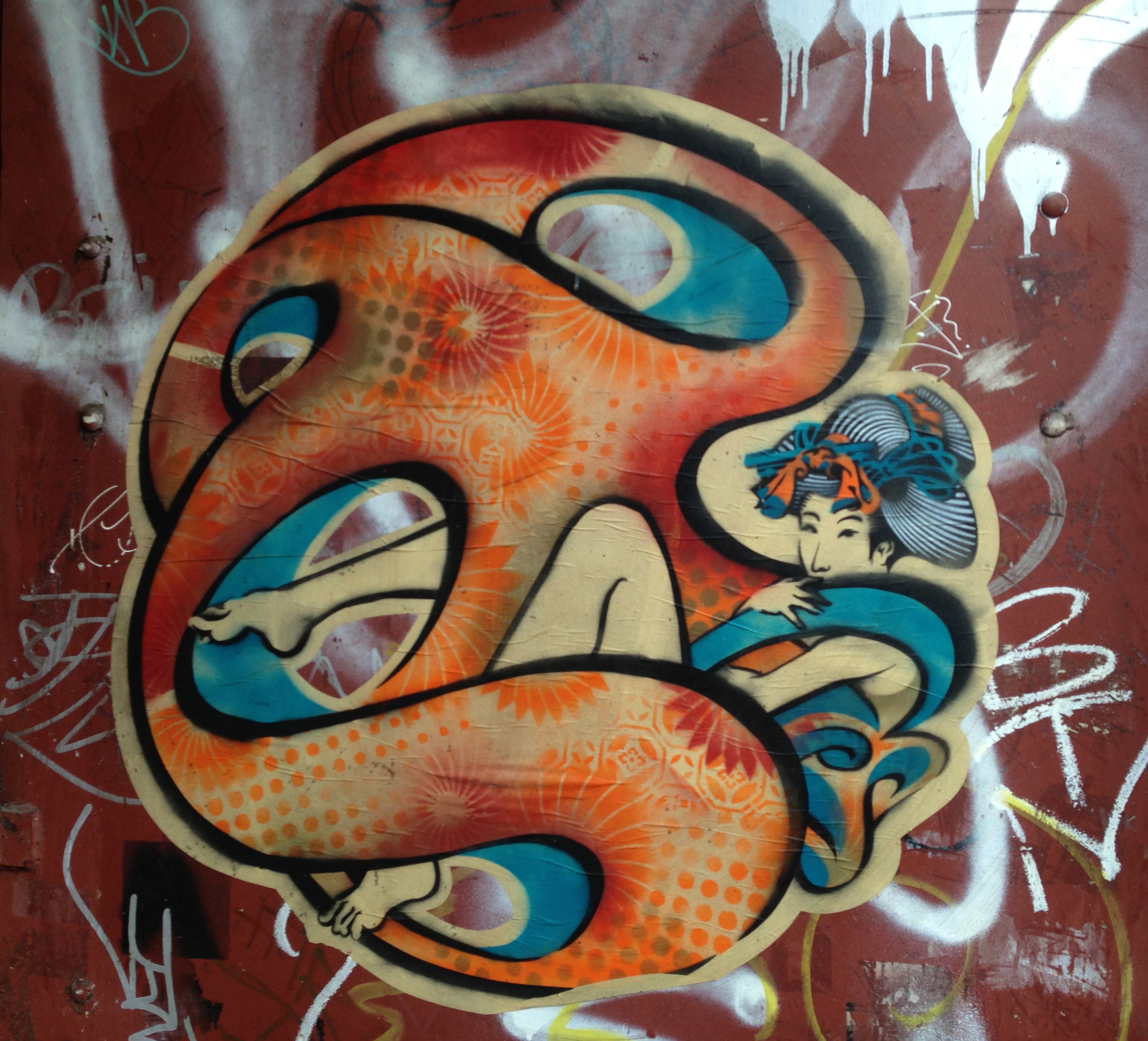 What? Well, this stylized octopus — another mollusk — meets Utamaro-inspired ukiyo/manga paste-up was not found in Central Park, but at the end of the day on Smith Street.