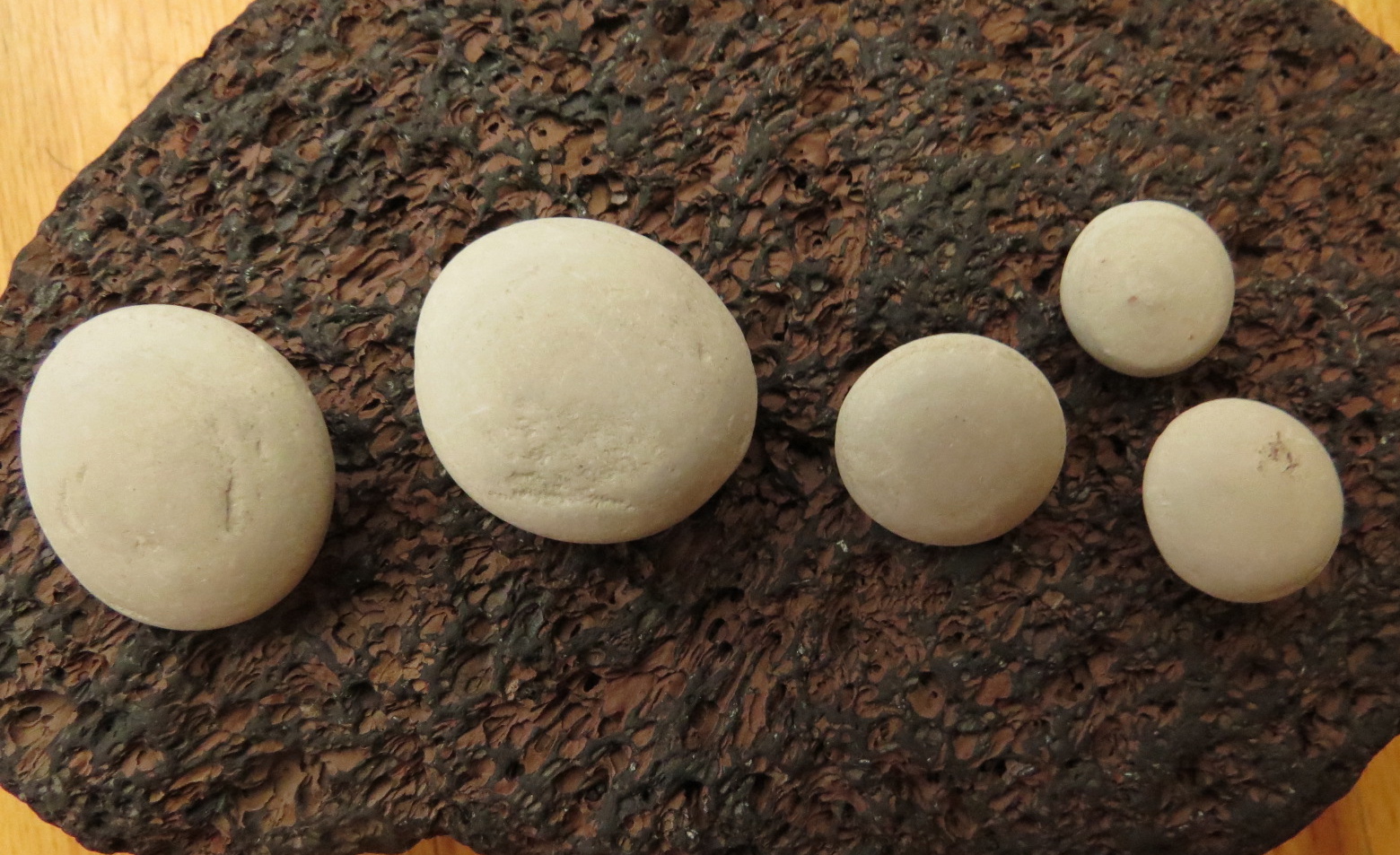 These smooth, hard clay nodules are from Croton Point Park, formerly the location of a brick factory. They were sticking out of a large pile of less-clayey material, as if the surrounding had been eroded away by… river, rain, wind, all of the previous? The largest is the diameter of a quarter.
