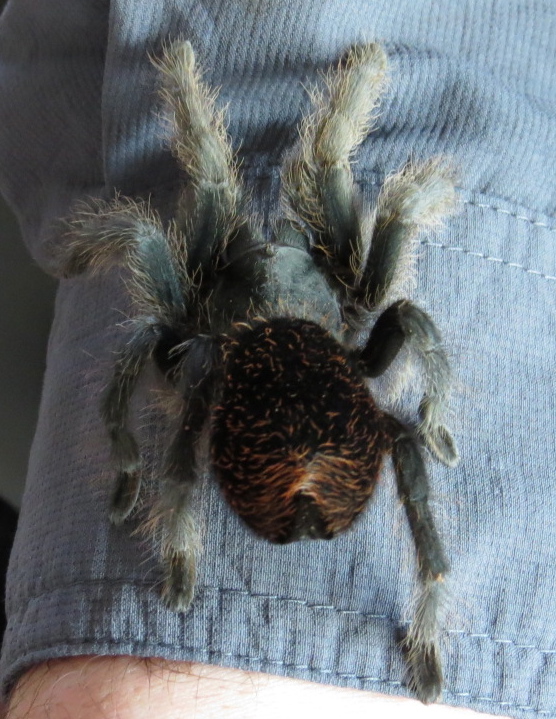 The males wander over a wide range searching for females this time of year, usually at night. The reddish hairs on the abdomen are urticating, that is stinging, so no petting. The bite is no worse than a bee sting. But according to the American Tarantula Society (well, obviously!) the things are harmless. I hadn’t read that when Jake offered up a chance a to hold this guy. There were various “no thank yous,” from my van mates but I proffered my hand… cautiously, but