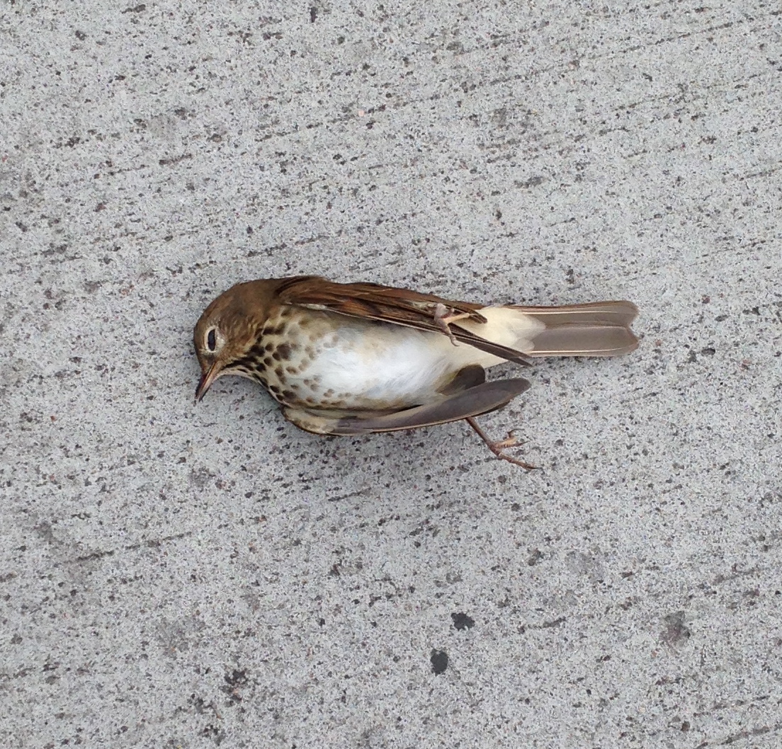 A Hermit Thrush (Catharus guttatus), much in evidence in the parks now as they head south, who didn’t make it. Hit a window in Coney Island.