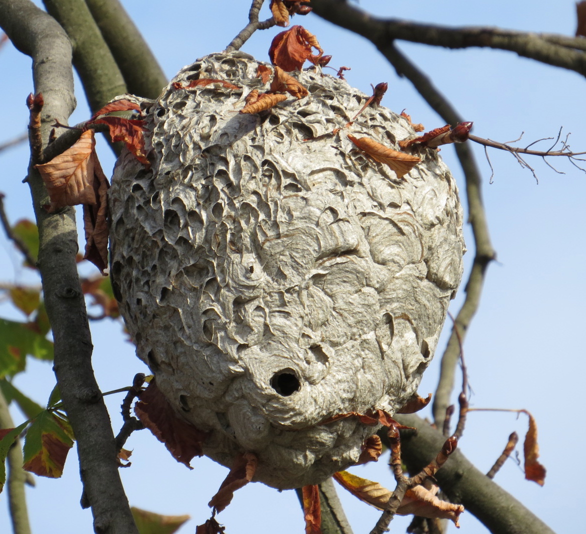 Revealed by the thinning of the leaves, two more Bald-faced Hornet (Dolichovespula maculata) nests: