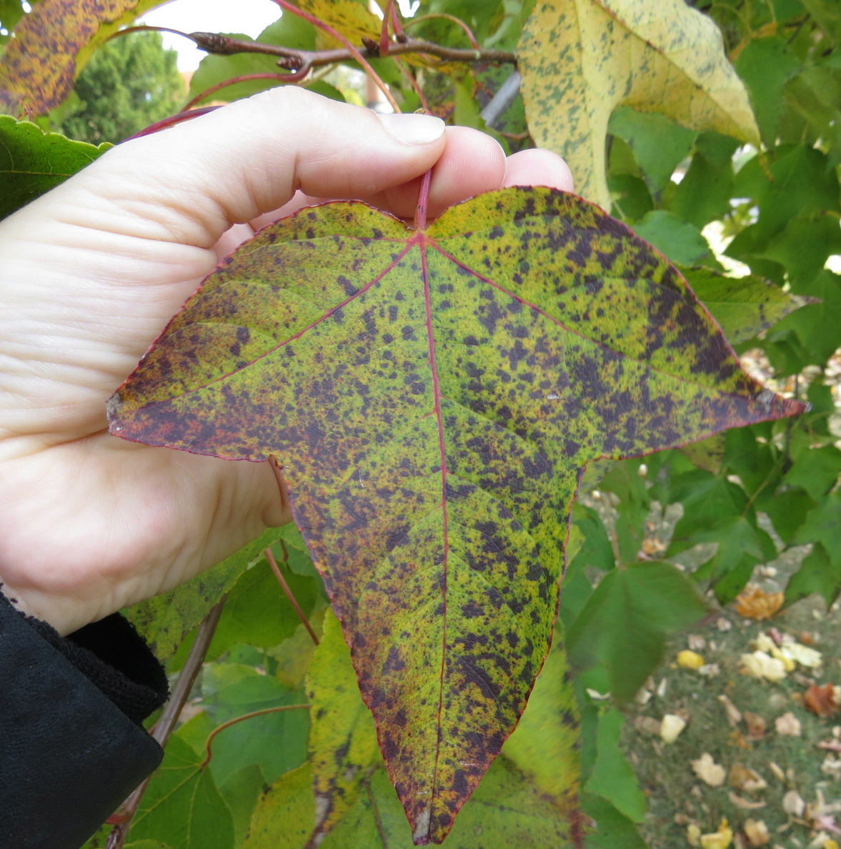 Now, Green-Wood has an impressive range of trees, many fine specimens, but they aren’t necessarily local or even native to North America. Bingo! This is Liquidambar formosana, the Chinese or Formosan Sweetgum.