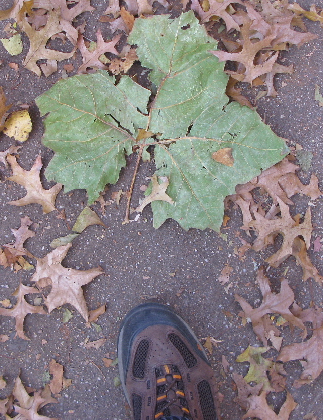 “And all the leaves on the trees are falling,” this time of year, some of them enormous. My friend and fellow nature blogger Melissa of Out Walking the Dog sent me a photo the other day of a very large face-covering leaf I thought might be American Sycamore (Platanus occidentalis). The very next day I was walking (mile 30 of 1000) near the corner of 6th and 6th and found some similar giants underfoot my size 9s.