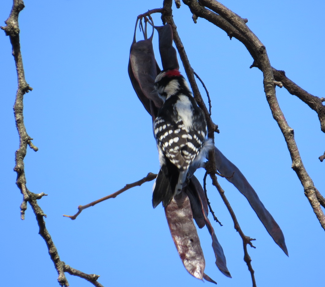 The sound was like typist behind a closed door, in an office with thick carpets. It was subtle. In the clamor of the city, we must strive to hear the subtle sounds, and Green-Wood, wind-swept atop the moraine, is a fine place for the subtleties. This Downy Woodpecker (Picoides pubescens) was pecking away at Honeylocust (Gleditsia triacanthos) pods still hanging on the tree, looking for invertebrates that had burrowed into the pods. The seeds inside the pods reverberated to the tapping, making that pleasing, nostalgic sound.
