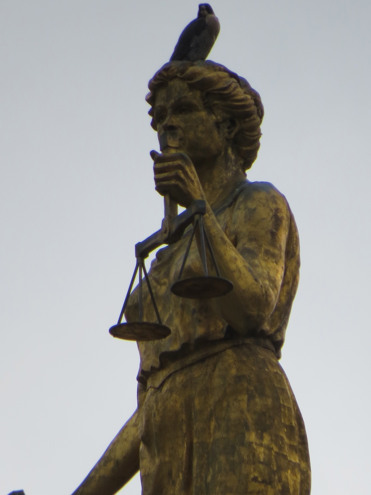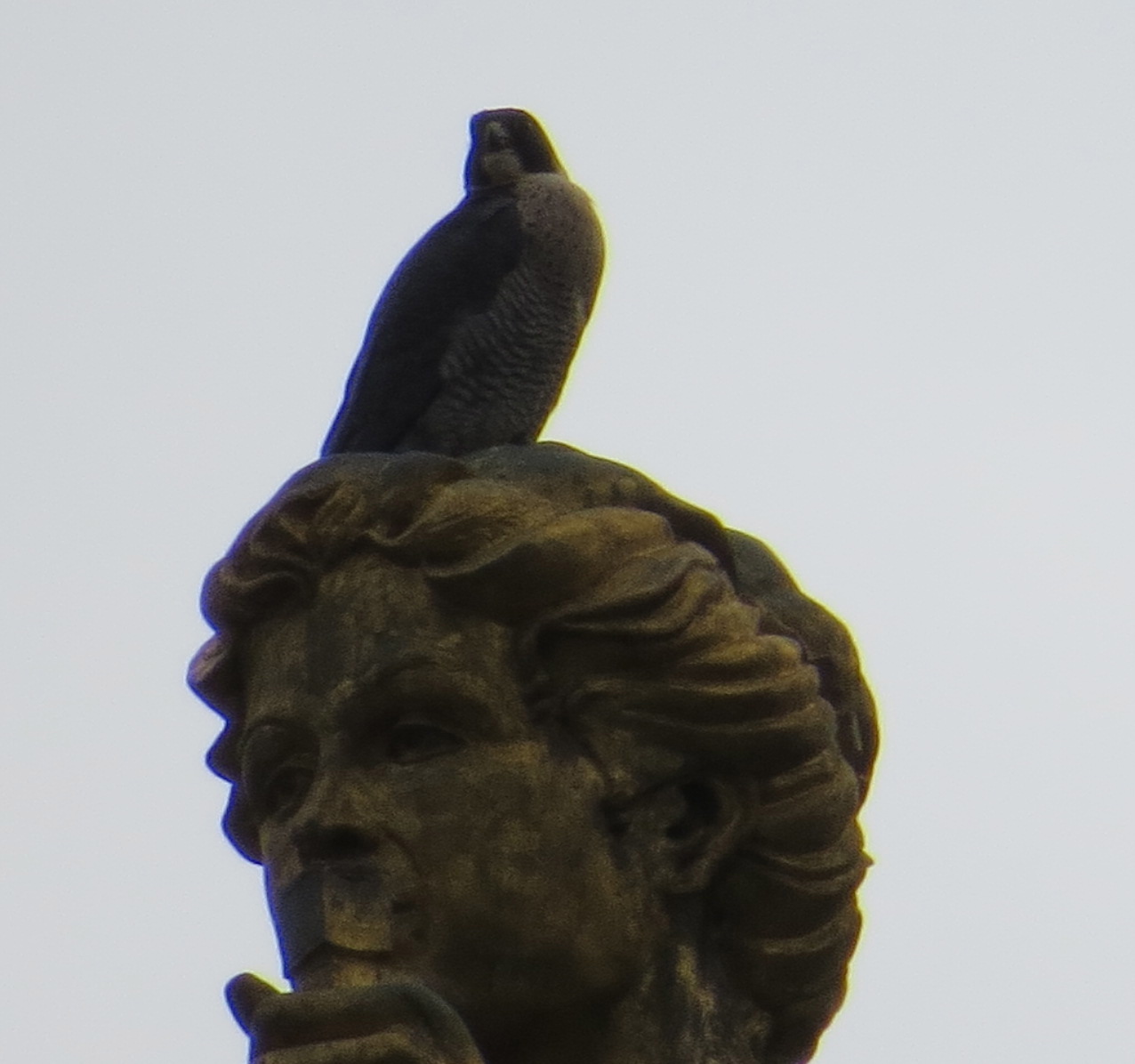 … a bird on the head of all-seeing Justice atop Brooklyn Borough Hall. My first thought: probably a pigeon, yet this looked too upright for that. My view from below on the street could account for that angle, of course, but there were, notably, no other pigeons in evidence. Ah-ha, the pigeons’ ancient enemy? So I pulled my camera from my bag to see if I could get a better view and confirmation or denial.