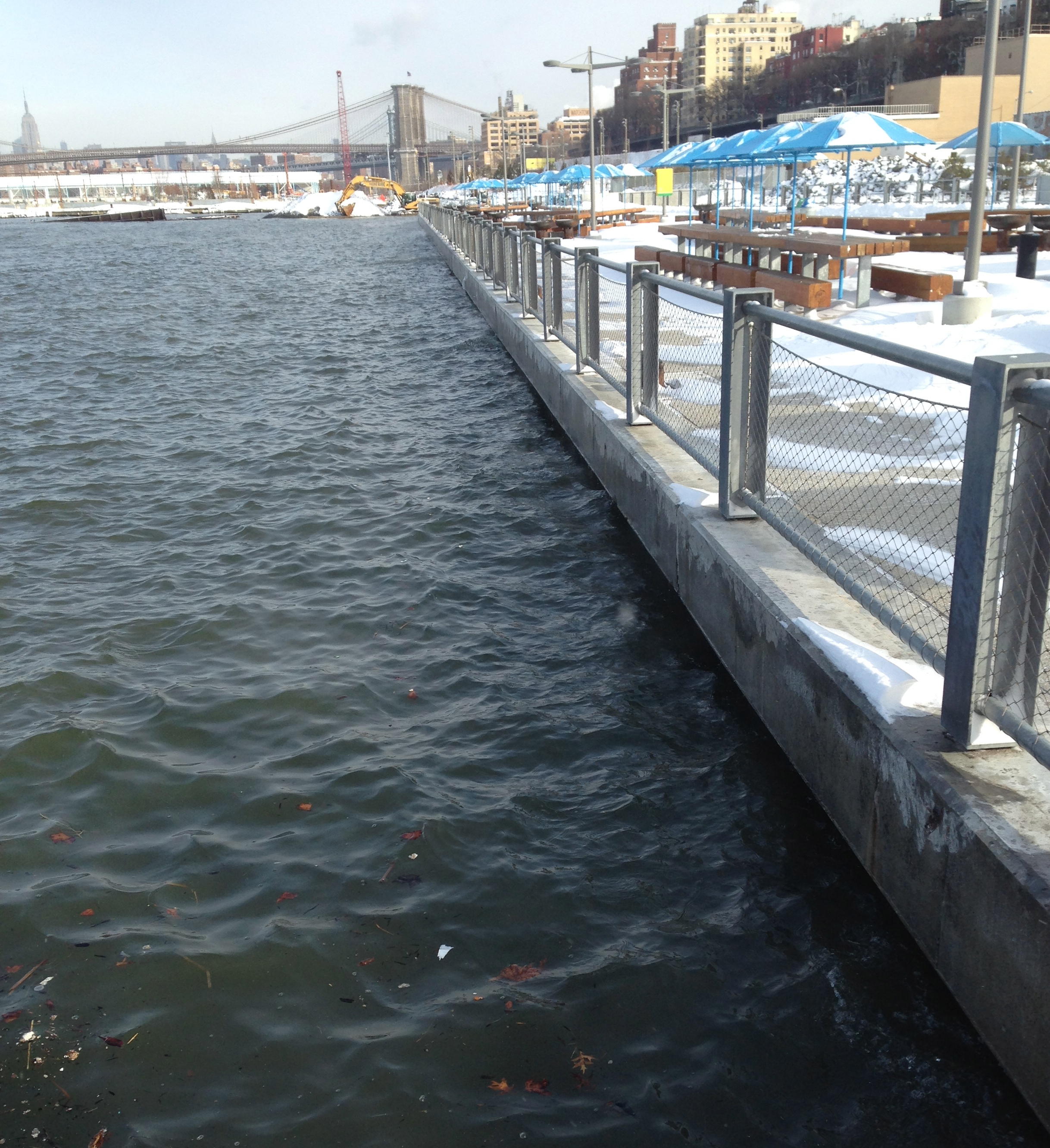 Rather more impressive was the high tide. I actually missed it by an hour, but it was still pretty high, the whole harbor looking bloated and swollen. A couple of tractors working on the beach section-to-be between Piers 4 and 5 were sitting in water. I’d give the park here a generous 2.5 feet before flooding (again, this was an hour after the tide’s peak). It’s scary how low so much of the city is (Sandy was a super storm, surging in on a high tide, but it was thankfully not a super hurricane).