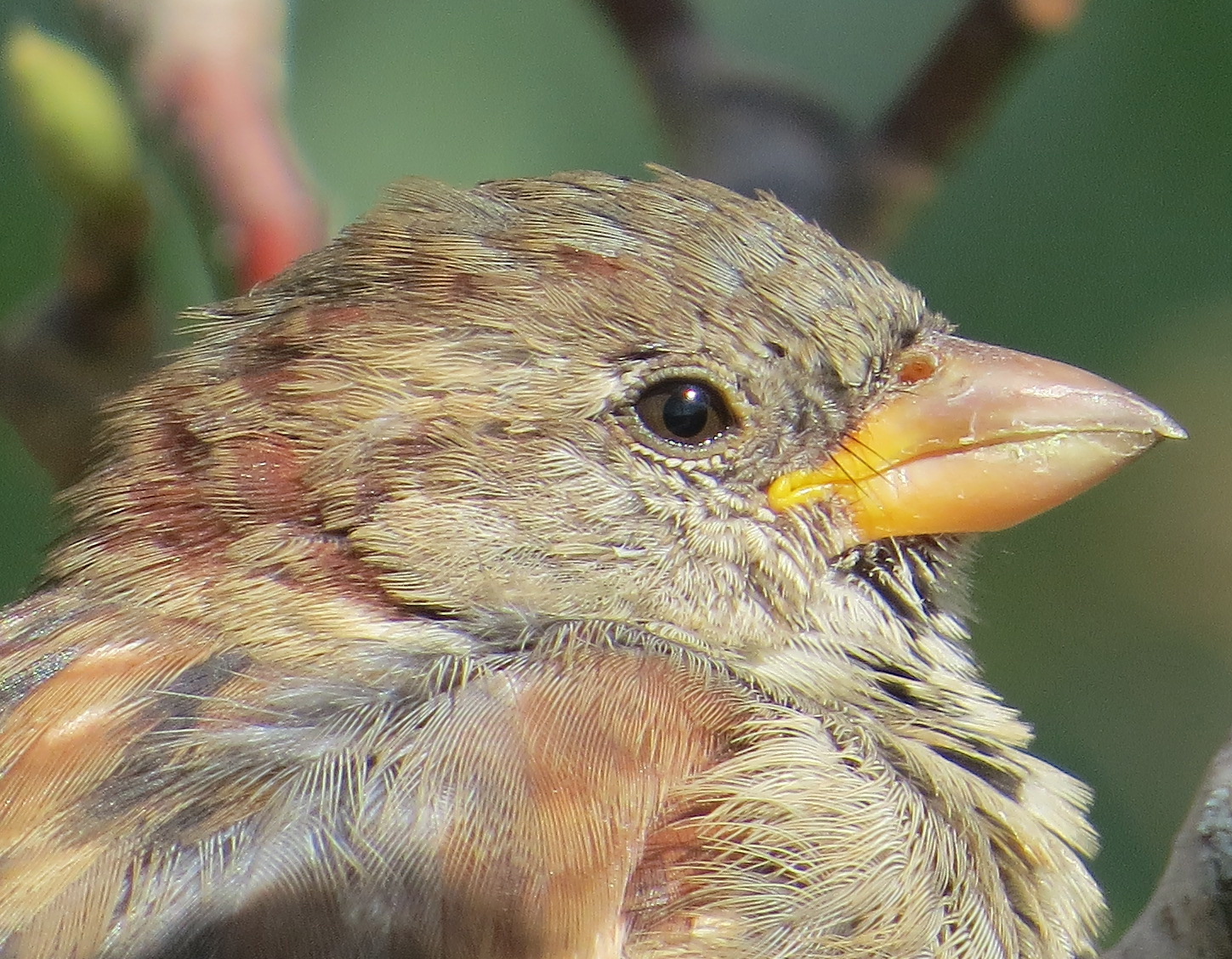 Our most common birds give us great opportunities to examine them in detail. Here’s a close up of a House Sparrow (Passer domesticus). The bony upper and lower mandibles of birds are covered with a horny sheath of keratin, which is why it reminds me of unkempt fingernails, since it’s essentially the same material. The hole at the top is one of two nares, which are like nostrils, connecting to the respiratory system.