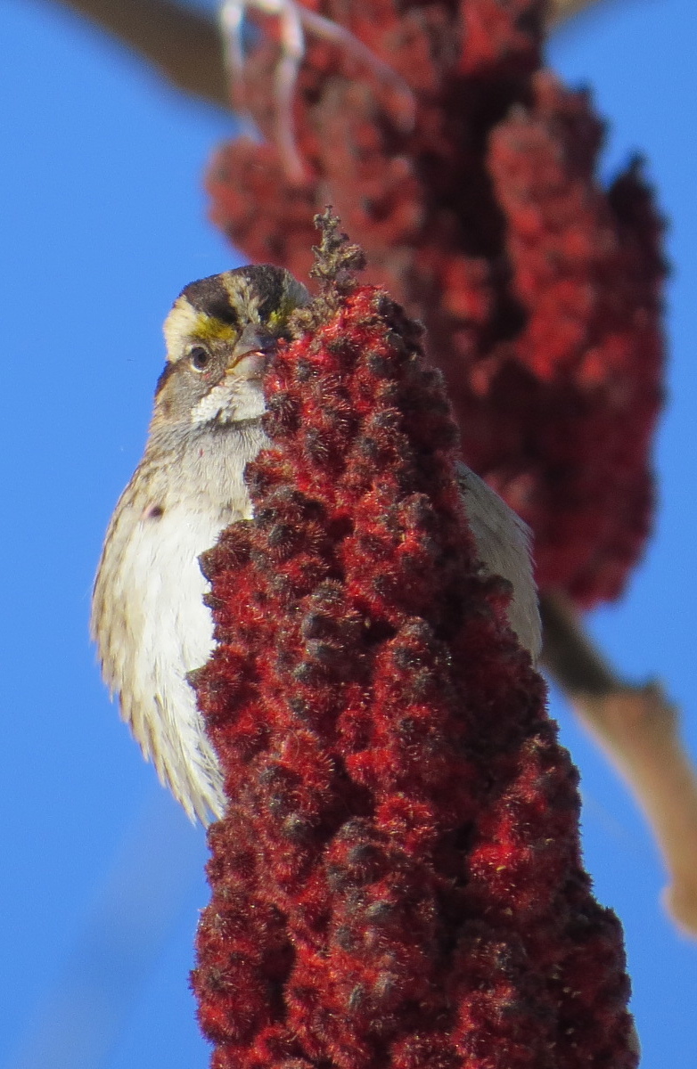 One of those indefatigable winter warriors, a White-throated Sparrow (Zonotrichia albicollis), in the life-giving Sumac. This is one of the easiest birds to identify by voice, since its call, transcribed as “Oh-sweet-Canada Canada Canada” or “Old-Sam-Peabody Peabody Peabody” (I have duel allegiances) is distinctive and frequent. These birds will head to Canada to breed, their absence a sure sign of winter’s end. But in the meantime, it’s the search for food amidst the snow. The small flock I watched looked like they were using their chests to clear little indentations in the snow. In leaves, they’ll use their feet to scritch-scratch away cover. This species is usually found on the ground, but in this case a passing pedestrian flushed them into the Sumac, where they immediately began to beak-in.