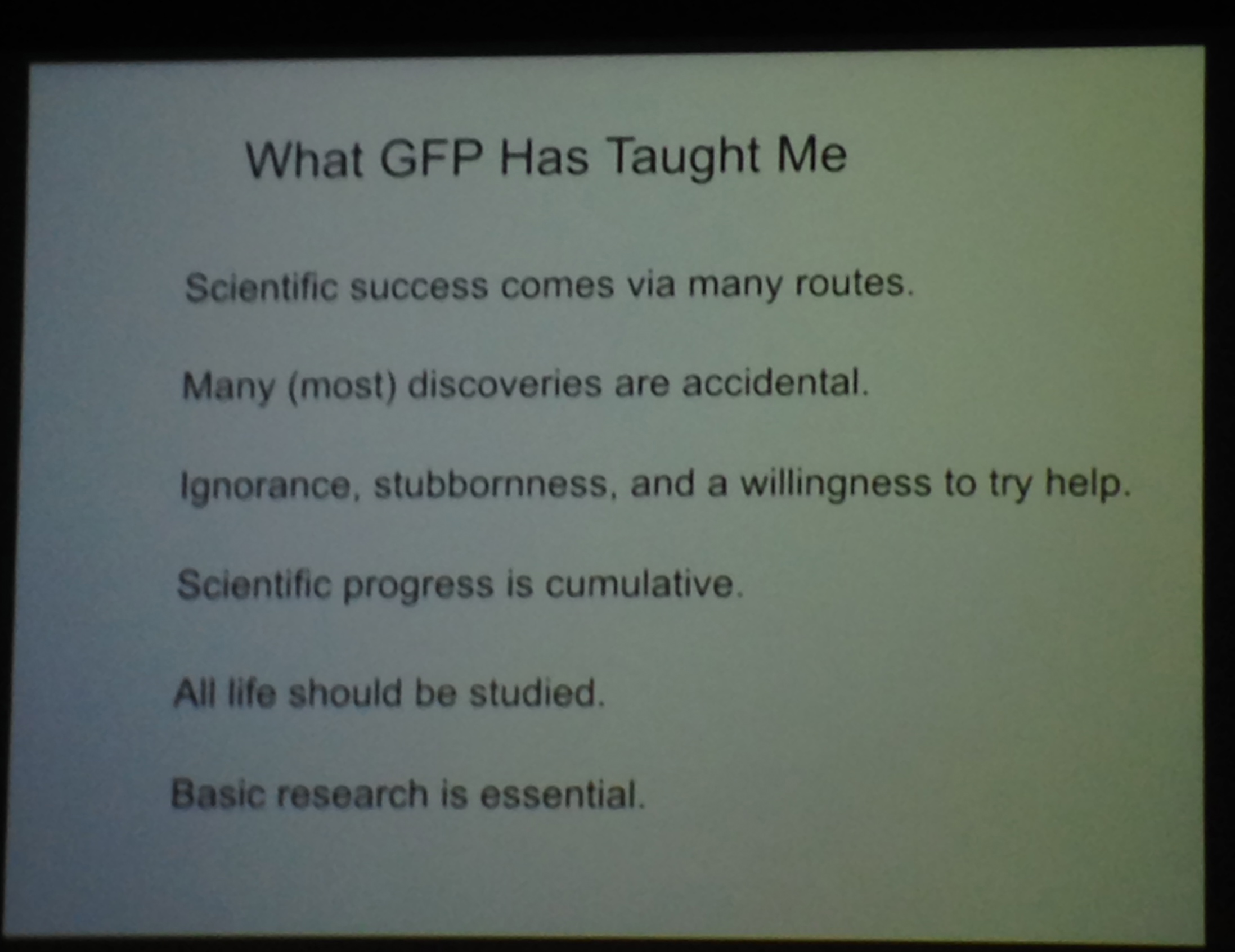 And some elementary wisdom from Martin Chalfie, who shared the 2008 Nobel prize in Chemistry for the discovery and development of green fluorescent protein. He spoke about his work last night at the Linnaean Society.