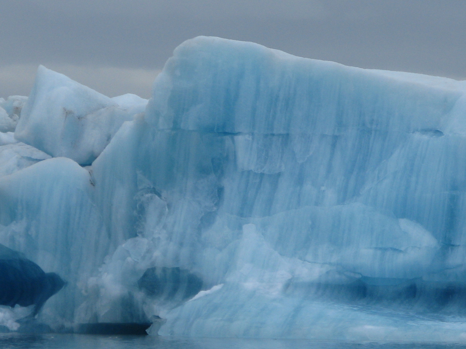 Glaciers — hark ye, children, when you’re old there will be few if any around — are made of ice compacted from snow. This is dense stuff, not like an especially large ice cube. The other colors of the spectrum are absorbed by this kind of ice. Only blue… escapes. Now, this little insignificant pile was obviously no glacier, yet it still gleamed with the beginning of that startling color. Here’s a bit of that blue, on an overcast day, in Jökulsárlón, Iceland.