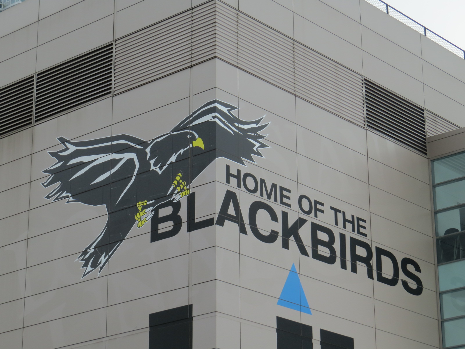 Suddenly the crow has turned hawkish. (There are black hawks, but not in this part of the world.) But of course crows — smart, family-oriented, beautiful, not nearly the nest-robbers that o-so-cute chipmunks are — get very little respect. How many other sports teams are named after them? LIU’s name evidently comes from their switch from blue to black uniforms in the 1930s. Note how they evidently feel the need to raptor-up the mascot today in our overly militarized culture.