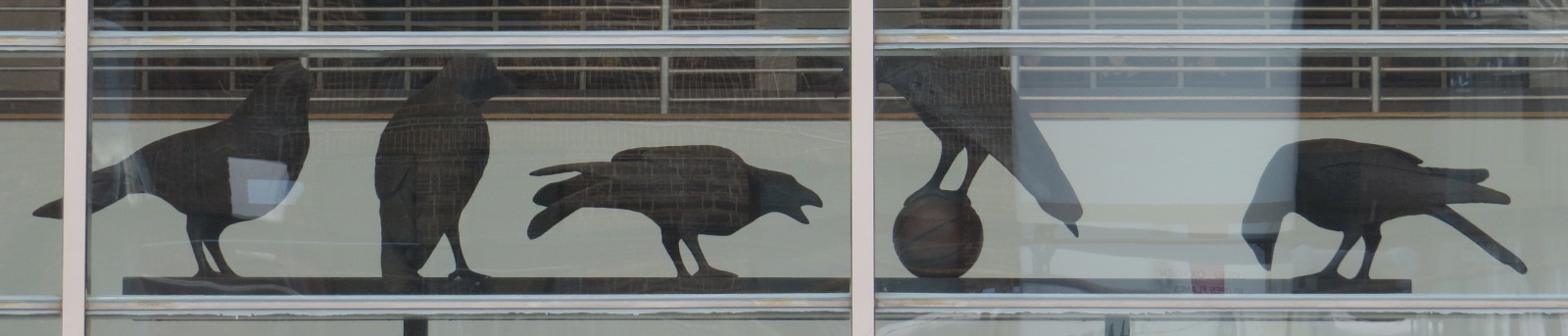 Right inside the “wellness center” at LIU Brooklyn’s campus. I assume it used to be a “gym,” short of gymnasium, which was where ancient Greeks played naked (Putin would plotz); gymnós meaning naked. Moving right along: those are pretty good corvid forms, if massively oversized. But what the hell is this on the corner of the same building?
